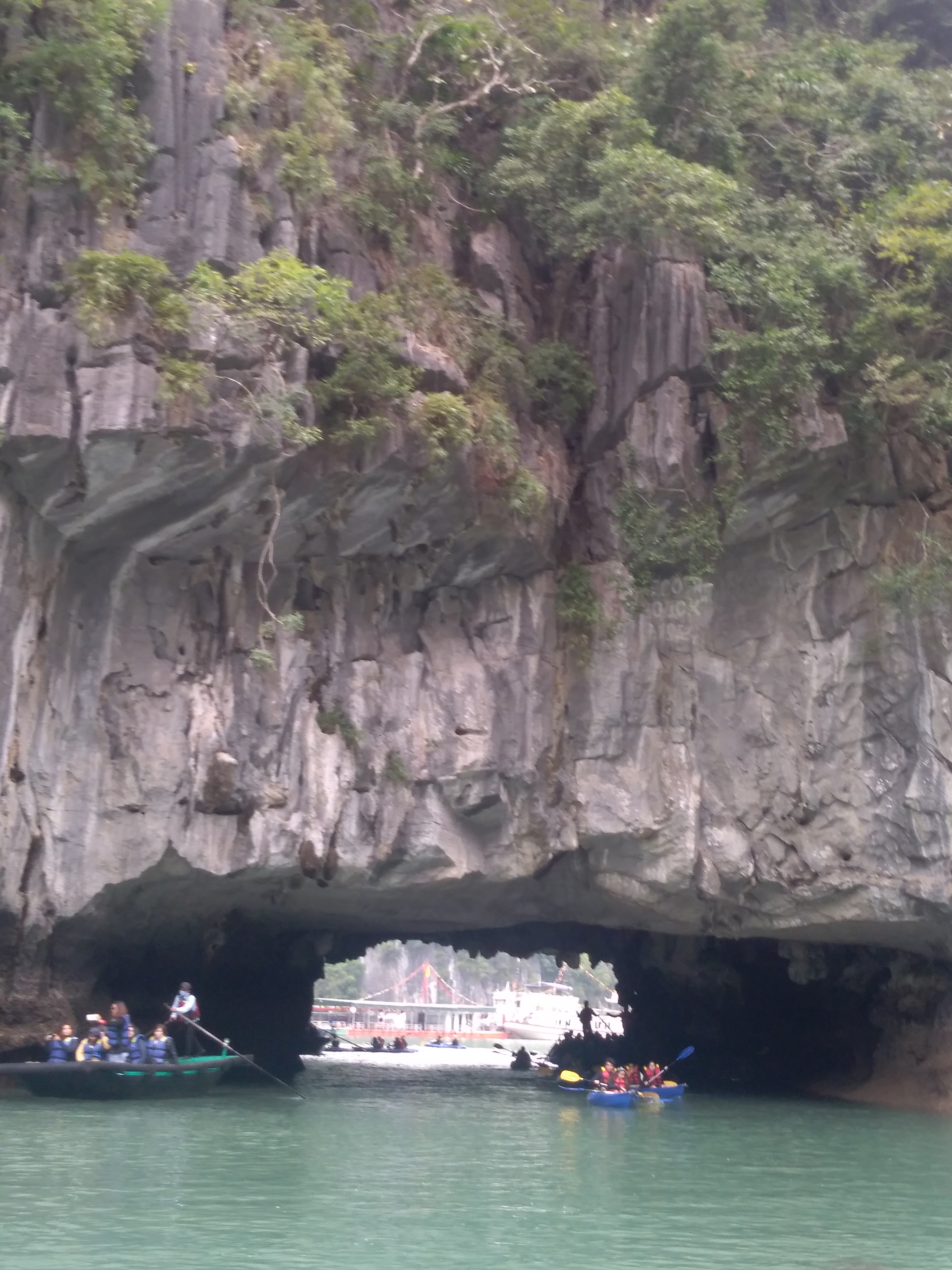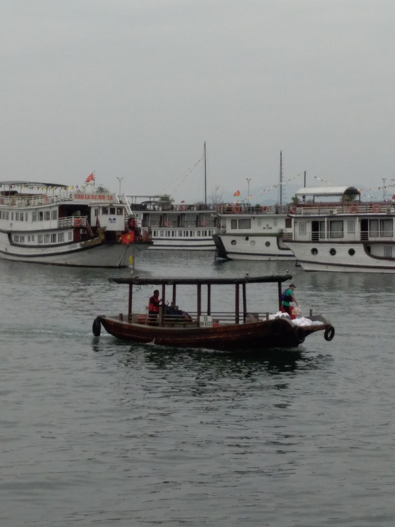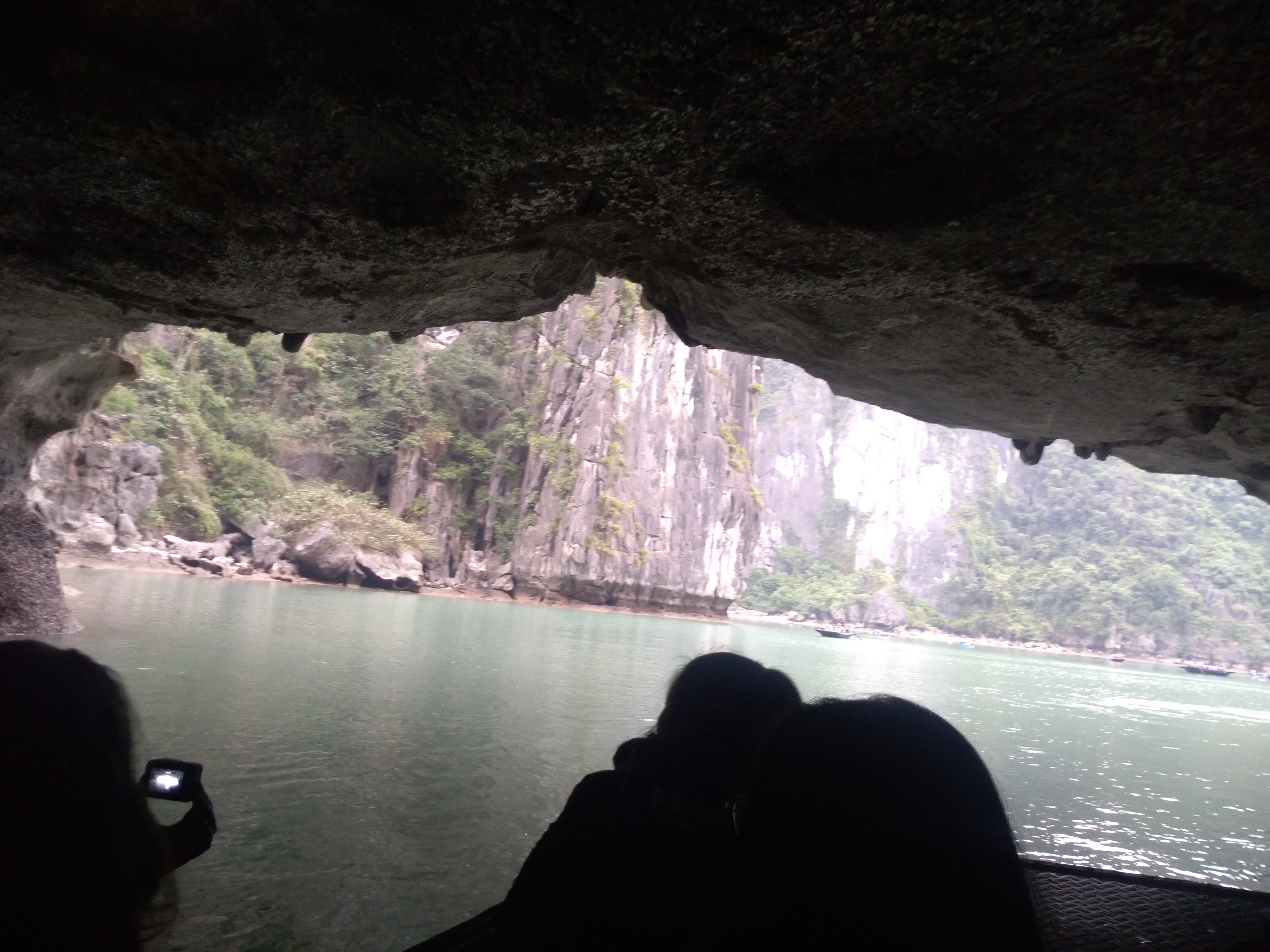 Ha Long Bay was magnificent! The small, yet tall tree covered mountains darted from the water in every direction. The only thing that could have made it more beautiful would have been to visit on a sunny day. Even with the grey backdrop, this place seemed majestic. There were lots of boats in the bay. I found myself thinking I hope we do not ruin this place with trash and chemicals from the boats.