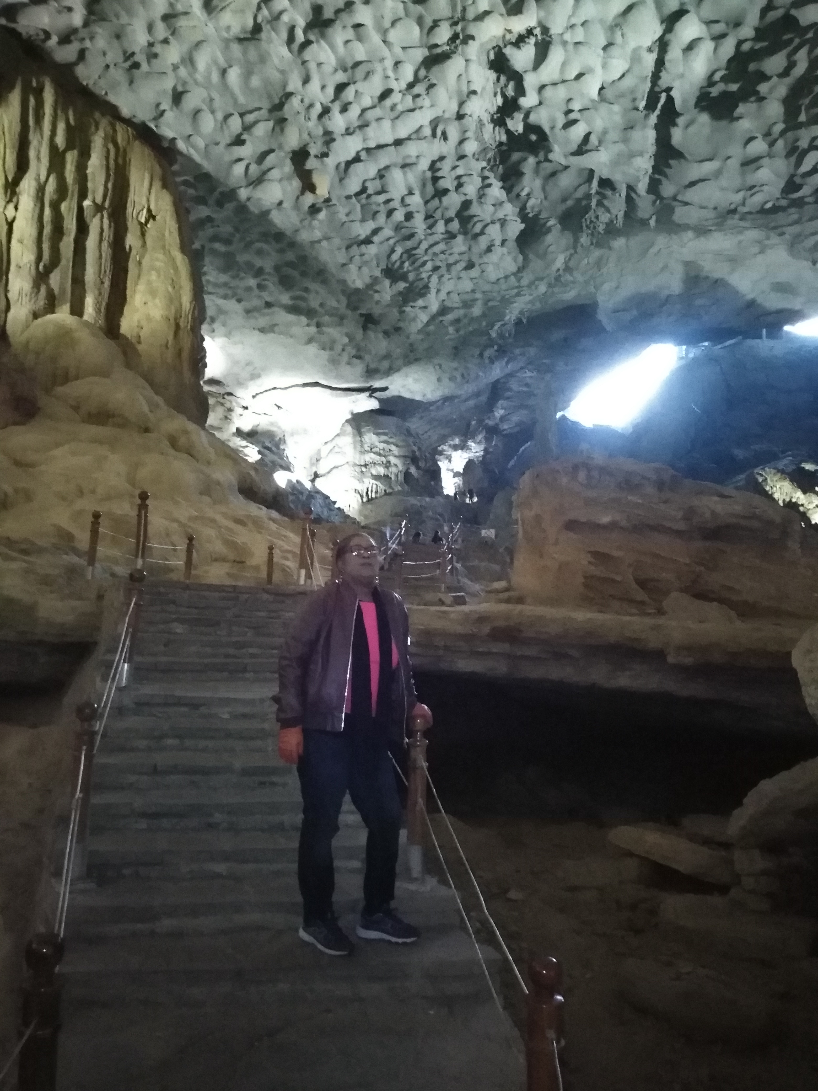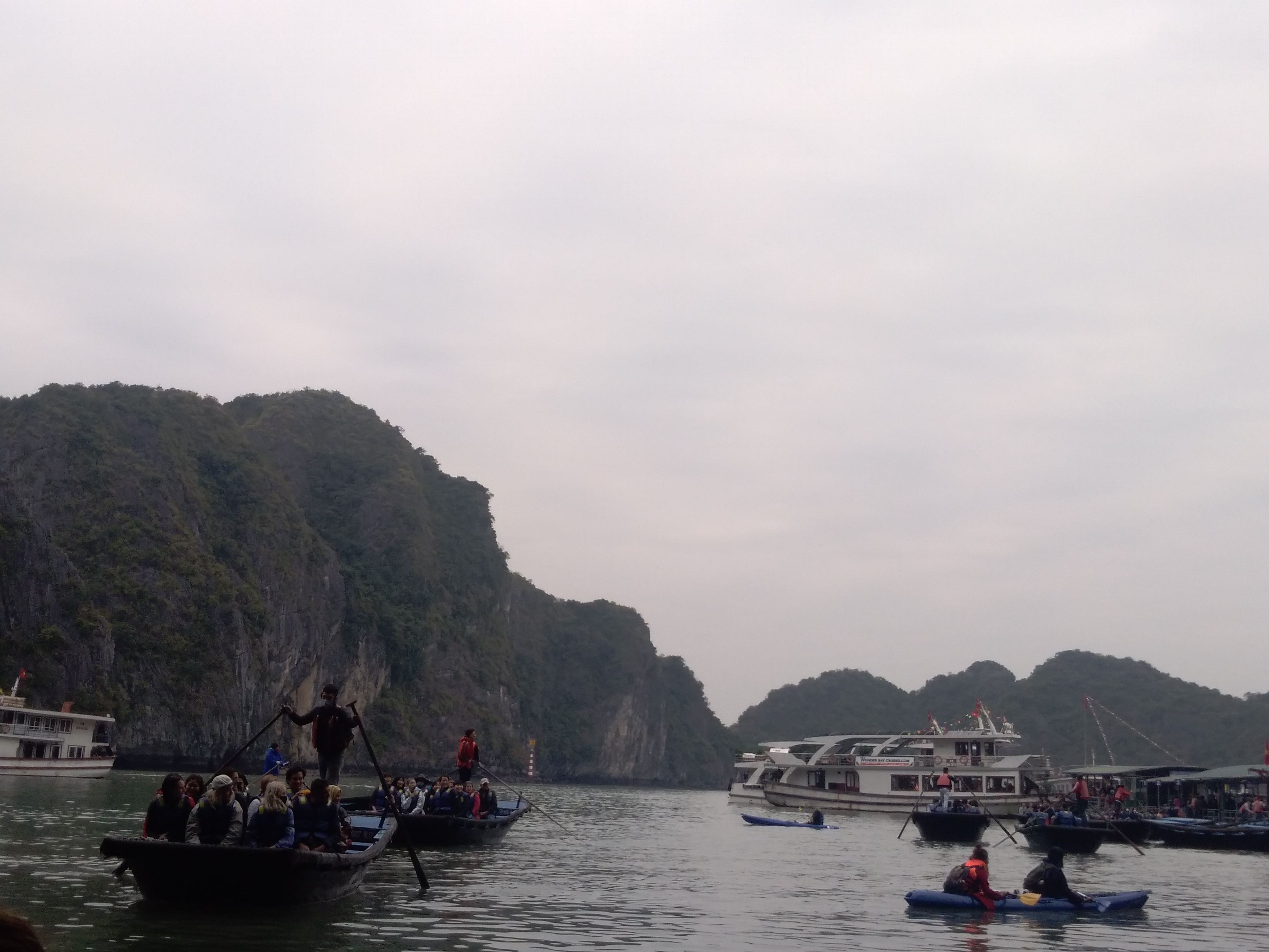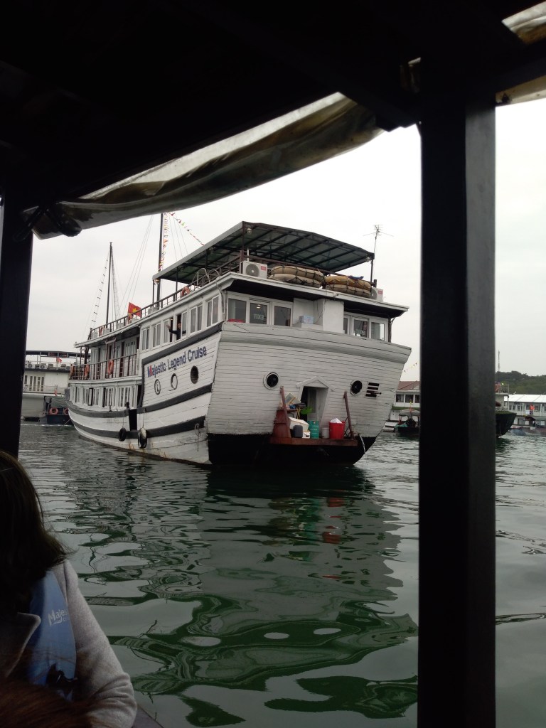Ha Long Bay was magnificent! The small, yet tall tree covered mountains darted from the water in every direction. The only thing that could have made it more beautiful would have been to visit on a sunny day. Even with the grey backdrop, this place seemed majestic. There were lots of boats in the bay. I found myself thinking I hope we do not ruin this place with trash and chemicals from the boats.